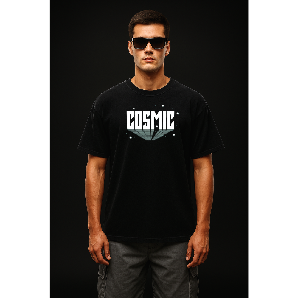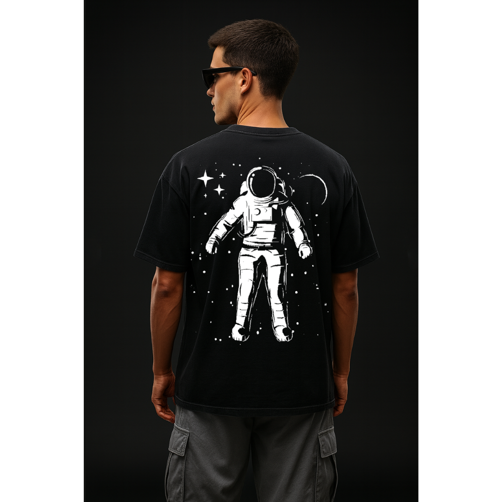 • Black Astronaut Tee: Minimal yet powerful space explorer graphic floating against the stars.