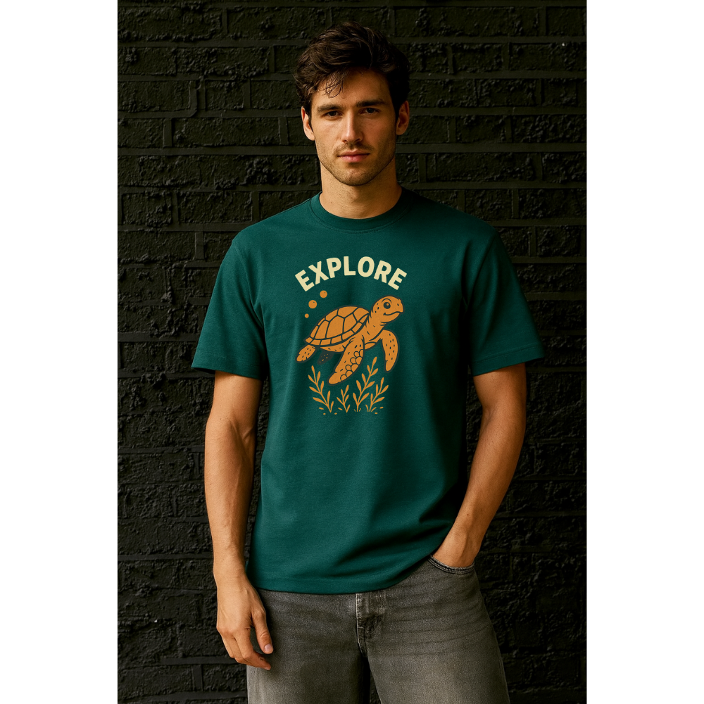 Discover comfort and creativity with our Explore Turtle Graphic Classic Fit T-Shirt. Made with premium 100% cotton fabric, this tee combines a timeless silhouette with a vibrant sea-inspired design that celebrates curiosity and exploration. The earthy orange turtle print adds a pop of contrast against the deep teal base, making it stand out effortlessly.