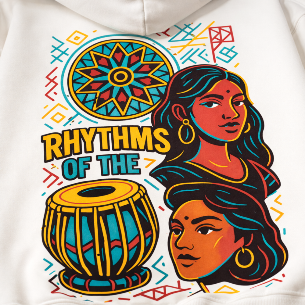 Rooted in culture and designed for modern streetwear, the Rhythms of the Roots off-white hoodie brings art and comfort together effortlessly. Set on a clean off-white base, the vibrant back print draws inspiration from traditional Indian rhythms—featuring expressive faces, a classic tabla, and intricate geometric patterns that tell a story of heritage and harmony.