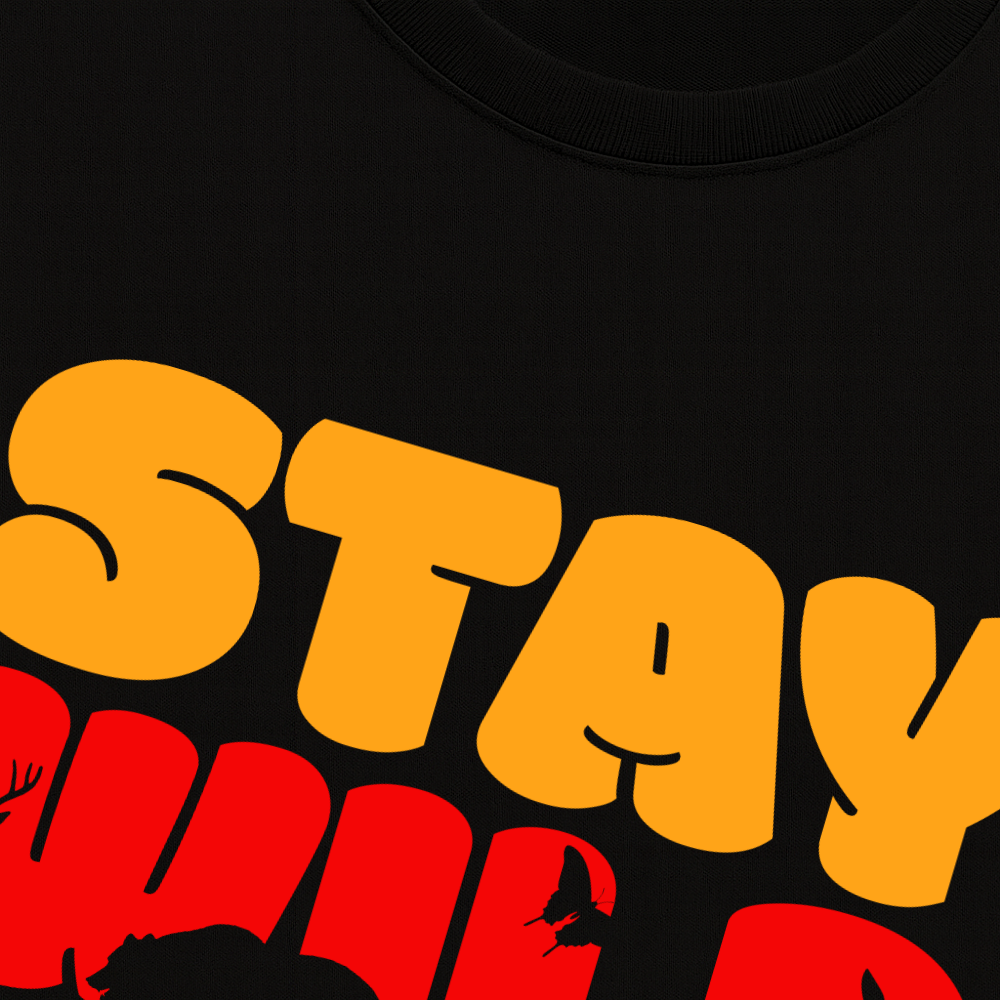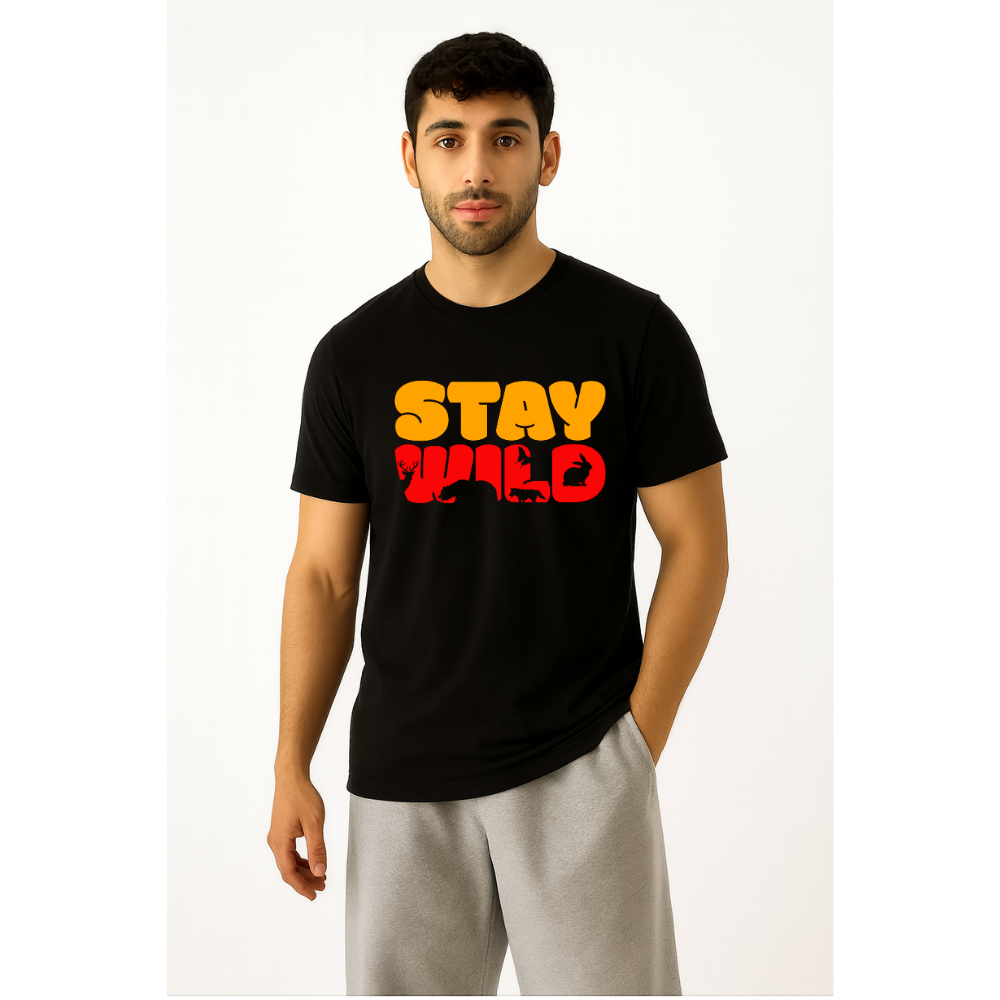 Featuring the bold “Stay Wild” graphic print in vibrant yellow and red, this tee is a statement piece designed for those who love to stand out. Pair it effortlessly with jeans, joggers, or cargos to keep your drip fresh and versatile.