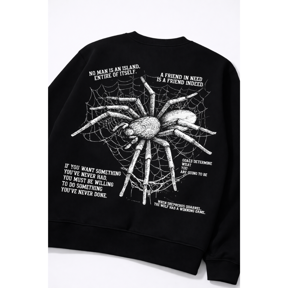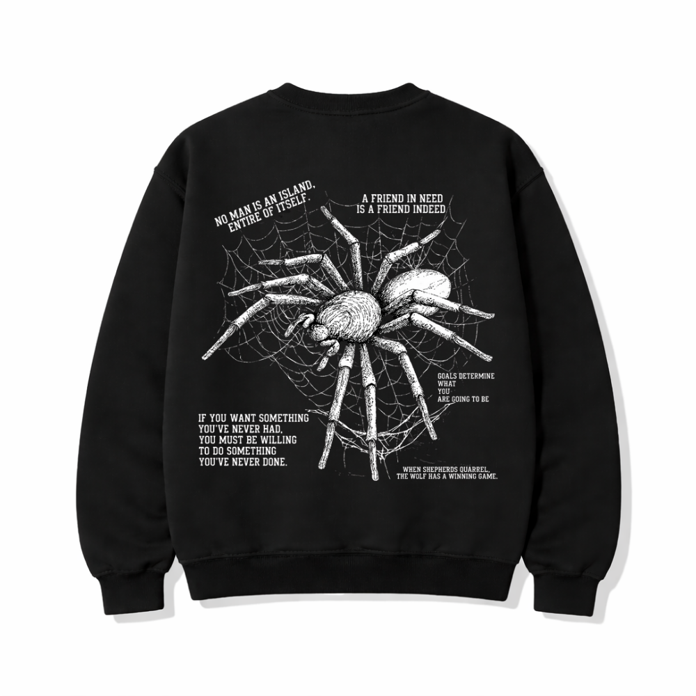 Wrap yourself in comfort with a message that hits deeper. This premium 100% cotton sweatshirt blends bold streetwear aesthetics with powerful life philosophies. The striking spider & web graphic symbolizes connection, resilience, and purpose—because every move you make shapes who you become.